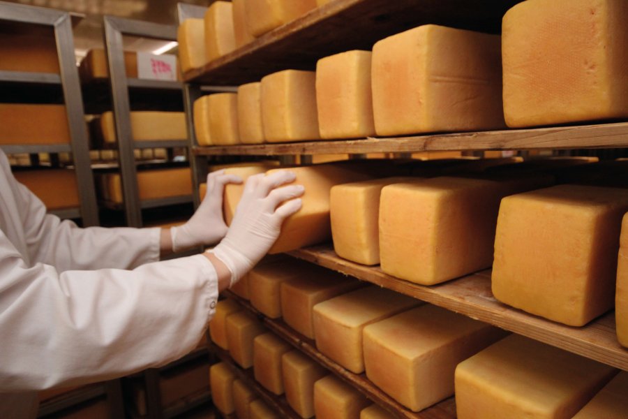 Im Anschluss daran kommt die wichtigste Phase, die unserem Käse seinen besonderen Geschmack und sein einzigartiges Aroma verleiht: die Reifung in unserem Gewölbekeller. Für ein bis sechs Monate sorgen eine Temperatur von 14 Grad und eine Luftfeuchtigkeit von rund 95 Prozent für großartige Käseprodukte. Und so, wie zum Beispiel ein Champagner immer wieder gedreht wird, so drehen auch wir täglich unsere Käselaibe im Reifekeller, damit sie sich bestens entwickeln.